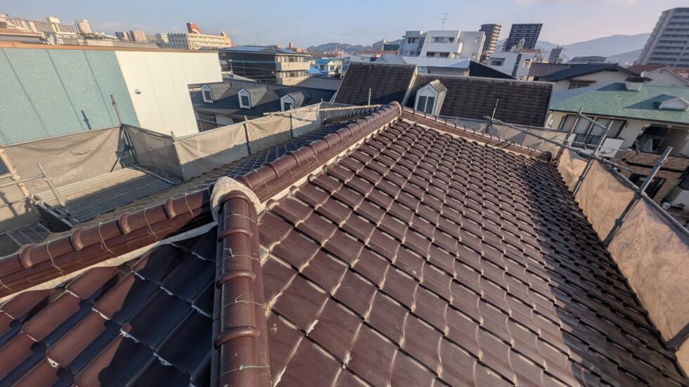 棟や瓦の隙間に過剰な瓦止め処理が施されていました。